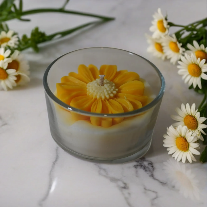Glass jar decorated with base wax and daisy flower candle infused with floral, calming and pleasant fragrances