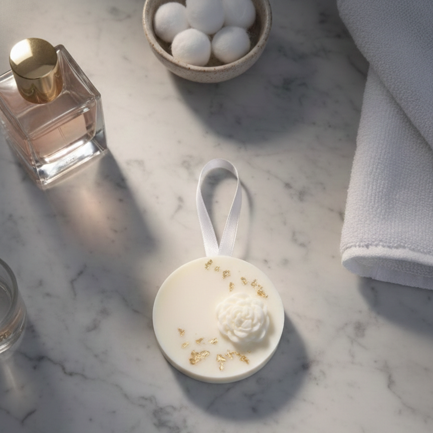 Elevate your personal spaces with the delicate elegance of the Woven Air Freshner wax sachet. This is a beautiful, artisanal way to infuse your private areas with a long-lasting, inviting scent. We craft these sachets from 90 grams of our pure, premium soy wax base, which provides a slow, steady release of fragrance without melting. The surface of the sachet is beautifully decorated, featuring a miniature pressed flower delicately "woven" into the wax, and finished with tiny, shimmering golden pearls. These embellishments make the sachet a true decorative accessory. The chosen scent is the classic, deeply relaxing aroma of Lavender, a non-toxic fragrance renowned for its soothing and stress-relieving properties. Imagine opening your linen closet to be greeted by this delicate bloom and its calming scent, or tucking it into a drawer to keep your clothes smelling fresh. The Woven Air Freshner is perfect for hanging in wardrobes, placing in drawers, or even using as a subtle, elegant room accent in smaller spaces. It is a fusion of fragrance, art, and function, bringing quiet luxury to the unseen corners of your home.